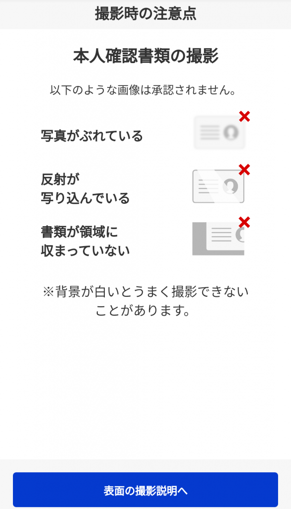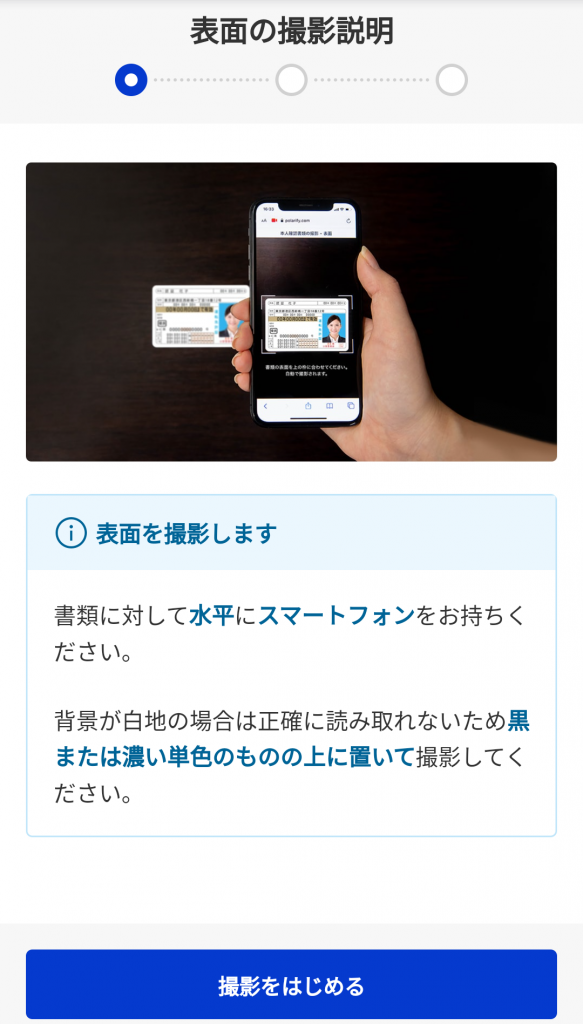 本人確認書類の表面・厚み・裏面の三種類を撮影します。