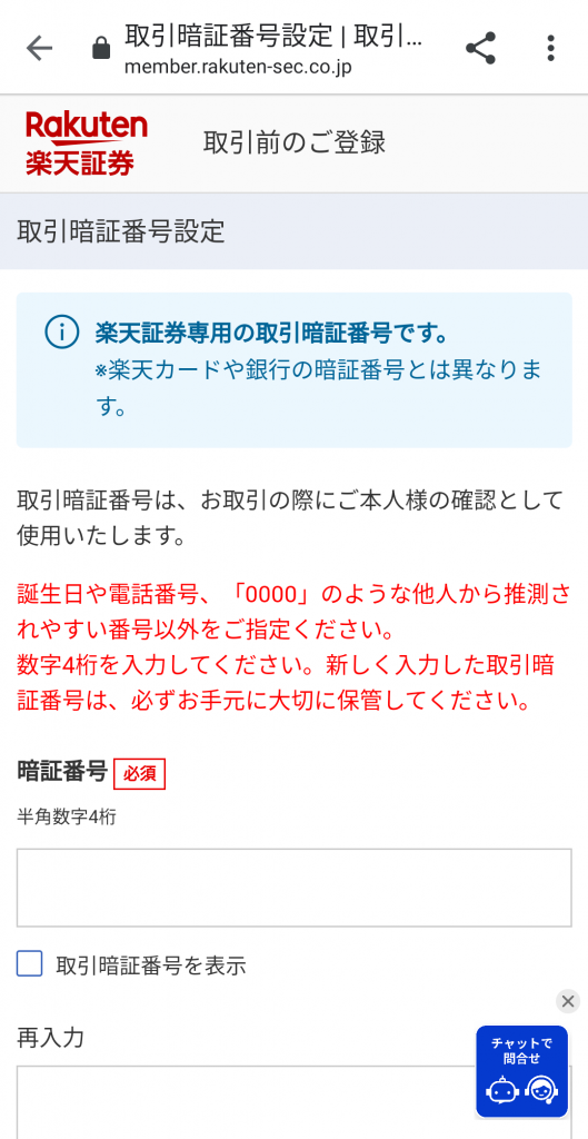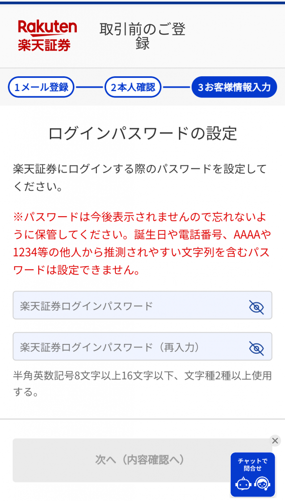 ⑦:楽天証券のログインパスワードを設定します。