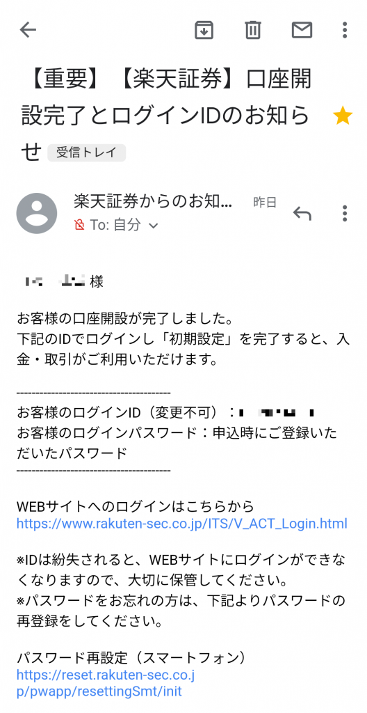 上記手順から1~2日後、登録したメールアドレス宛に『口座開設完了とログインIDのお知らせ』というメールが届きます。