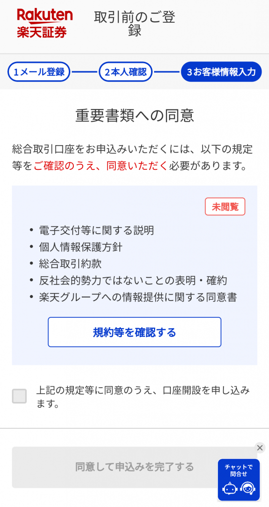 重要書類への同意を確認した上で、口座開設の申し込みにチェックを入れると、楽天証券の申し込みは完了です。