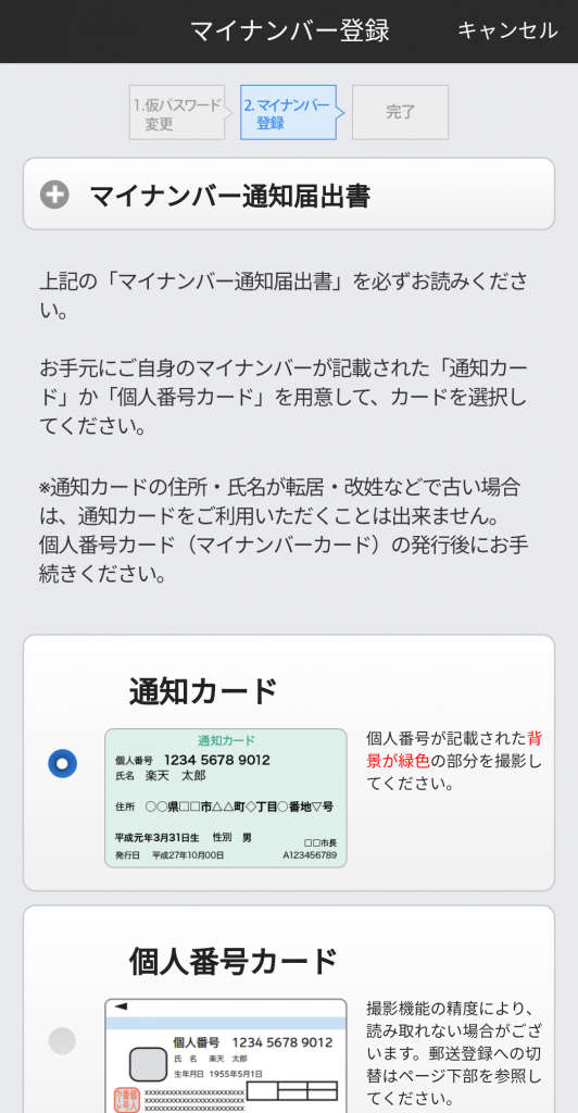 ③:マイナンバー通知カード・個人番号カード(マイナンバーカード)のいずれかを選択します。
